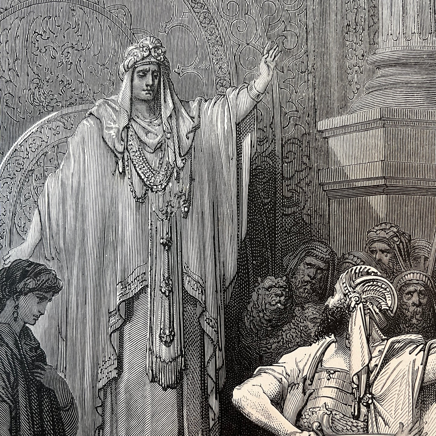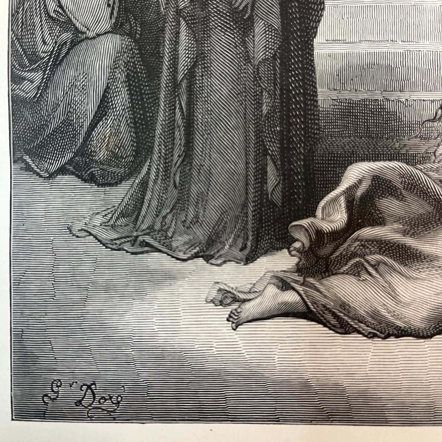 Dit is een originele houtgravure getekend en ontworpen door Gustave Doré en gegraveerd door A. Bertrand. De gravure komt uit 1875 en was onderdeel van een statige Bijbel 'De Bijbelsche Geschiedenis' voor het Katholieke Nederlandsche Volk. De Bijbel is gedrukt door Henri Bogaerts (opvolger van P.N. Verhoeven), drukker en boekhandelaar van Zijn Heiligheid Paus Pius IX. De pagina heeft een afmeting van 25x32,5 cm. Je kunt ervoor kiezen om de gravure los te bestellen of in een witte of zwarte passe-partout. Beide passe-partouts hebben een witte binnenrand en hebben de afmeting 30x35 cm.