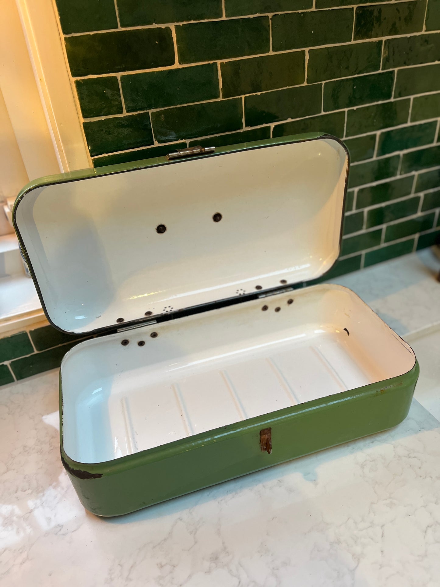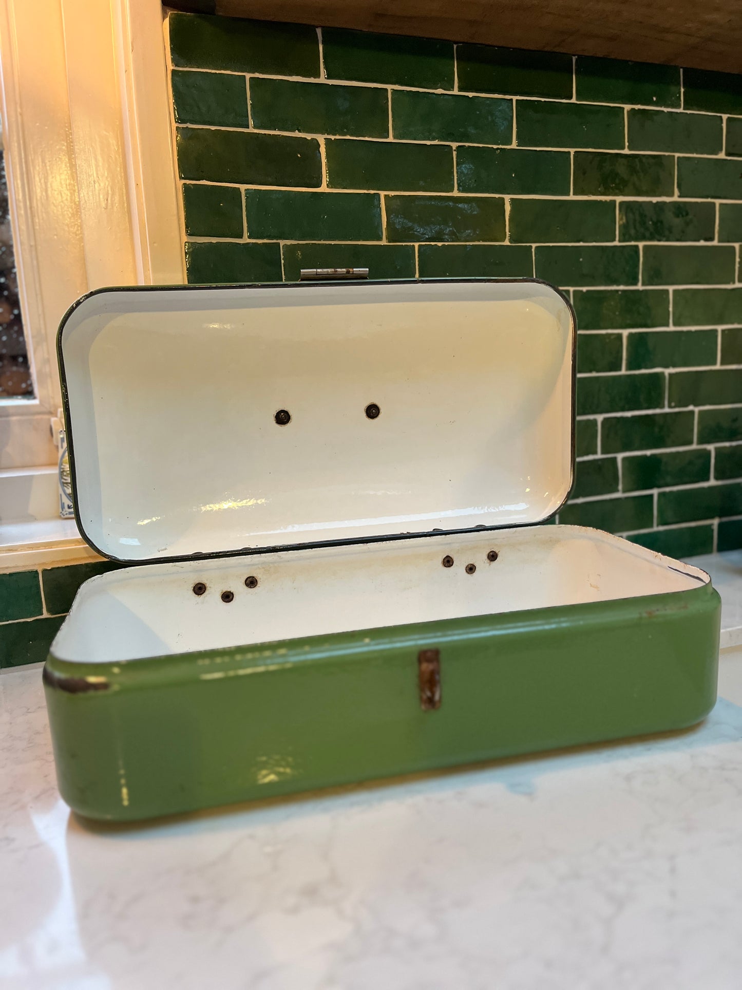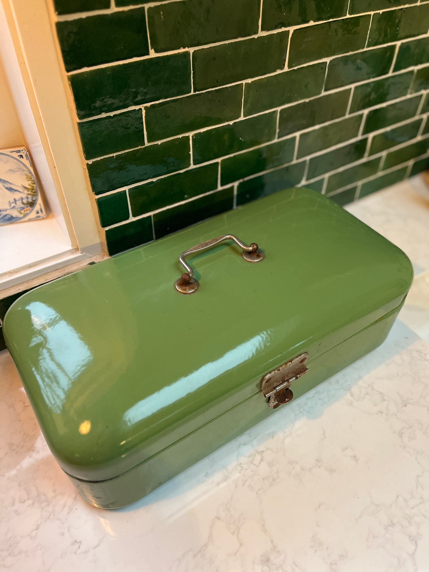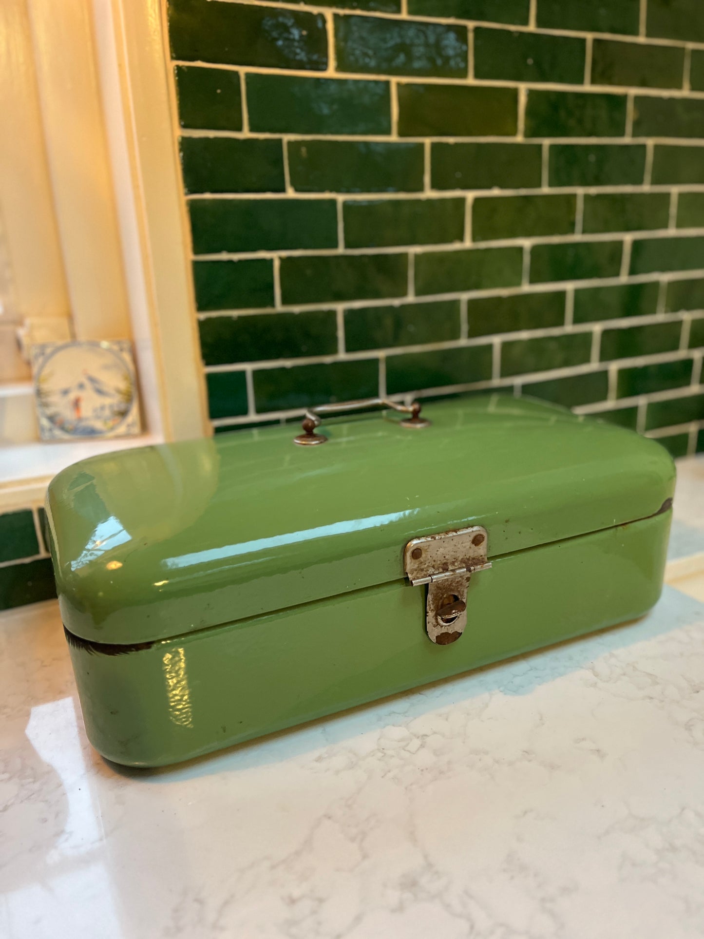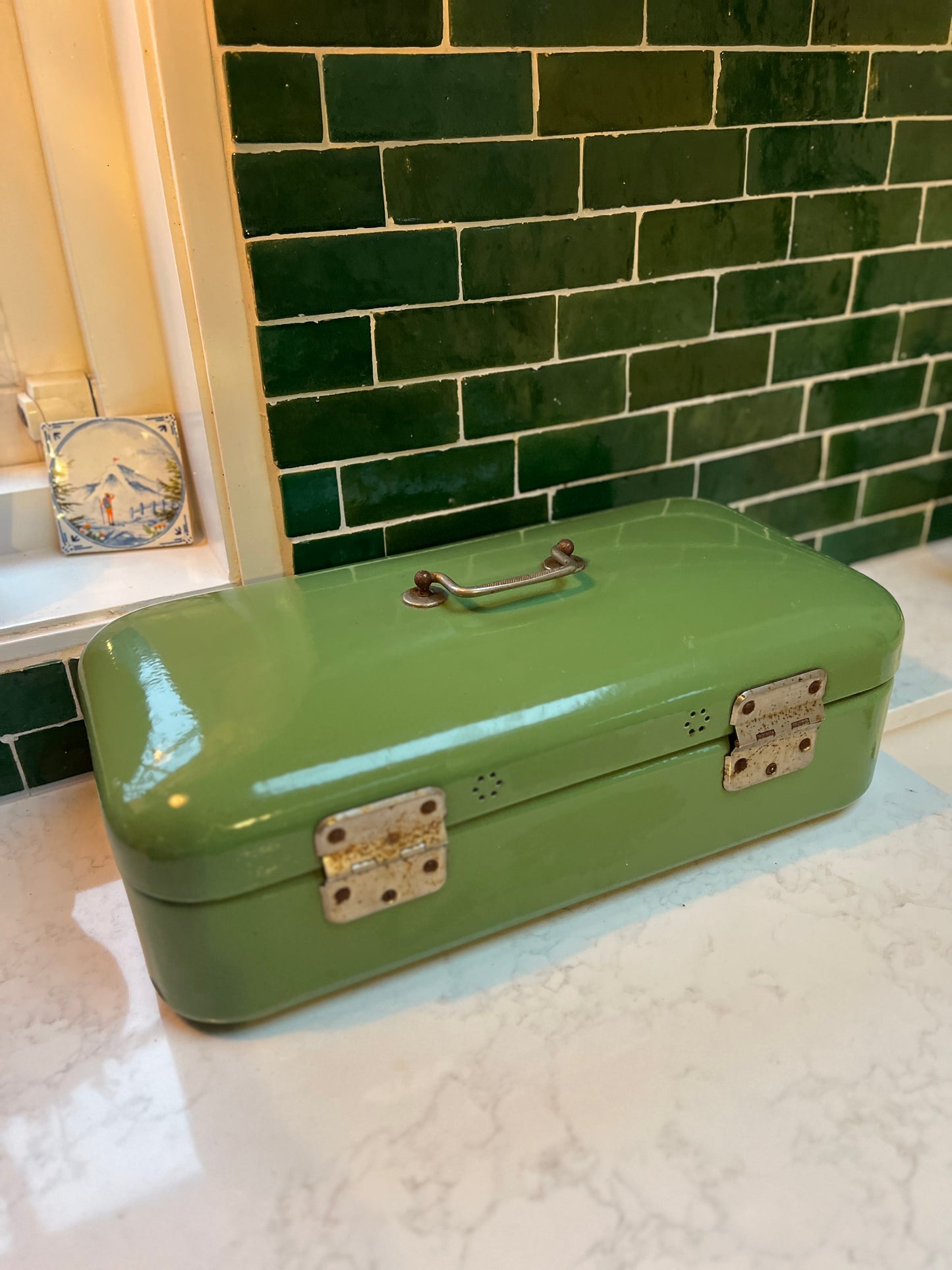 Emaille broodtrommel in vintage groen. Helemaal gaaf van binnen dus nog steeds goed te gebruiken.